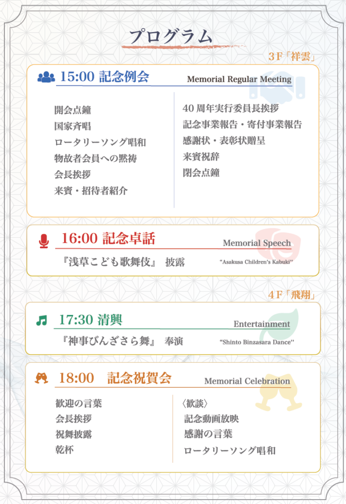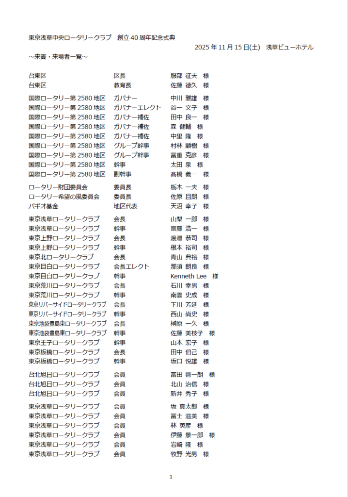 本日は東京浅草中央ロータリークラブ創立40周年記念式典に際し、ご多用のところご臨席賜り会員一同心より感謝と御礼を申し上げ