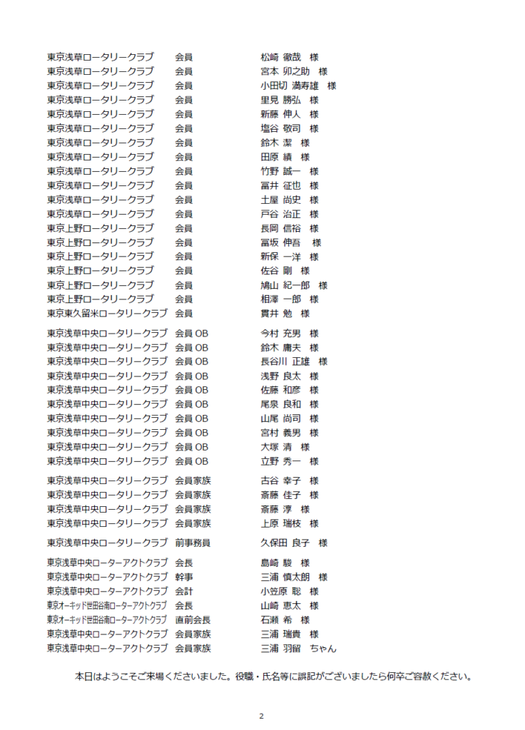 結びとなりますが、各クラブの益々のご発展とご臨席賜りました皆様のご健勝とご多幸をご祈念申し上げ、ご挨拶とさせていただき